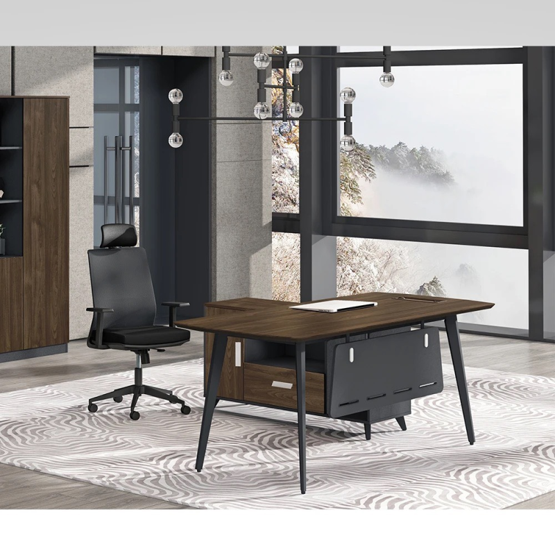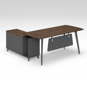 Bàn được thiết kế theo phong cách tối giản nhưng tinh tế, kết hợp giữa màu gỗ nâu và khung chân sắt sơn tĩnh điện màu xám đậm. Các đường nét vát cong nhẹ ở mặt bàn tạo cảm giác mềm mại và cao cấp, phù hợp với nhiều phong cách nội thất văn phòng.