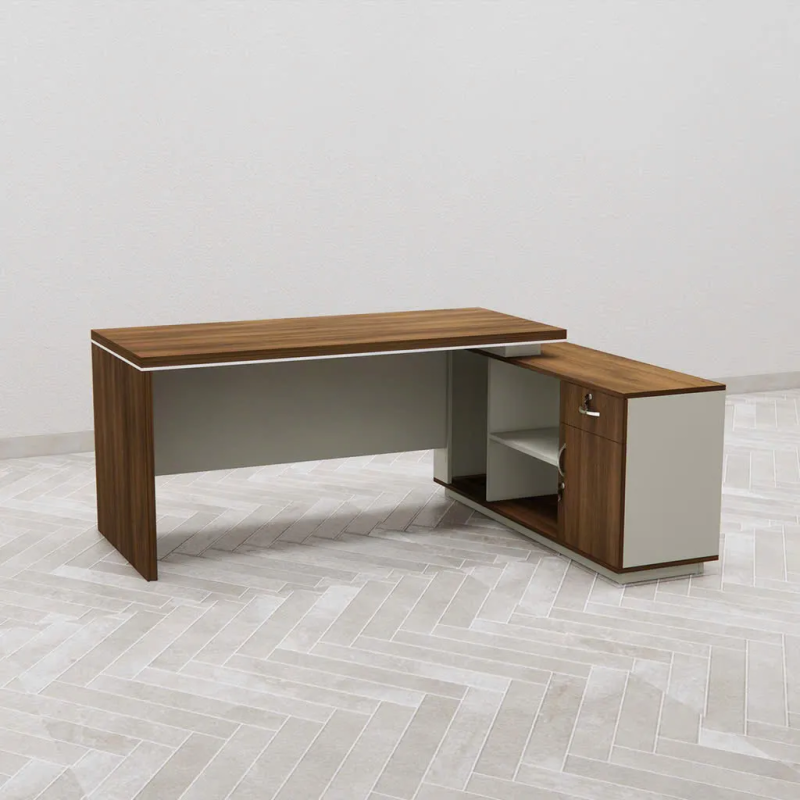 BGD-EU12 có kiểu dáng hình chữ nhật thẳng kết hợp với hộc tủ liền khối, tạo nên cấu trúc chữ L nhỏ gọn và tiện lợi. Kích thước tiêu chuẩn của bàn chính là 180 cm (Dài) x 80 cm (Rộng) x 75 cm (Cao), tối ưu hóa không gian làm việc mà vẫn đảm bảo tính thẩm mỹ. Bàn được thiết kế không chân (chân kín) ở một bên và hộc tủ khối hộp ở bên còn lại, tạo sự vững chắc và kín đáo.