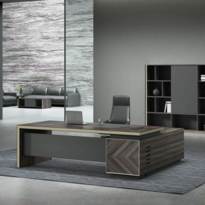 Sản phẩm nổi bật với tông màu vân gỗ tối (như nâu đen hoặc xám đậm), mang lại vẻ ngoài sang trọng, trầm lắng và quyền lực. Tông màu này dễ dàng làm nổi bật các thiết bị công nghệ và vật phẩm trang trí. Đặc biệt, mặt bàn có tích hợp tấm lót da (hoặc vật liệu giả da) màu tối nằm ở khu vực làm việc chính, vừa bảo vệ mặt bàn, vừa mang lại cảm giác êm ái, cao cấp cho người sử dụng.