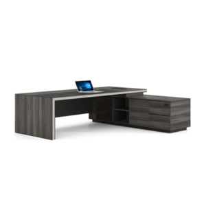 BGD-EU25 sở hữu kiểu dáng hình chữ L bề thế, bao gồm bàn làm việc chính và hộc tủ phụ liền khối, tạo ra một khu vực làm việc rộng lớn, thống nhất. Mặt bàn chính được thiết kế hai lớp với kích thước lớn, mang lại sự vững chắc và sang trọng. Điểm nhấn là đường viền kim loại sáng chạy quanh mép bàn, tạo sự phân lớp và tăng tính thẩm mỹ cao cấp, khiến chiếc bàn trở nên nổi bật hơn.