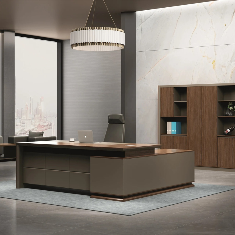 Sản phẩm nổi bật với tông màu vân gỗ tối (như nâu đen hoặc xám đậm) cho toàn bộ mặt bàn và các khối hộc tủ. Tông màu trầm này thể hiện sự quyền lực, chuyên nghiệp và dễ dàng làm nổi bật các thiết bị văn phòng. Phần yếm bàn (mặt trước) được phối màu xám trung tính, tạo sự tương phản tinh tế, làm nổi bật đường viền kim loại và tăng chiều sâu cho thiết kế.