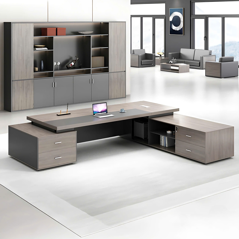 BGD-EU39 sở hữu kiểu dáng hình chữ L hiện đại, kết hợp bàn làm việc chính và hộc tủ phụ liền khối, tạo thành một khu vực làm việc thống nhất và tối ưu. Mặt bàn chính được thiết kế dày dặn, tạo cảm giác kiên cố và vững chắc. Thiết kế khối hộp cho chân bàn và hộc tủ, với đường nét vuông vắn, dứt khoát, thể hiện sự chuyên nghiệp và uy quyền.