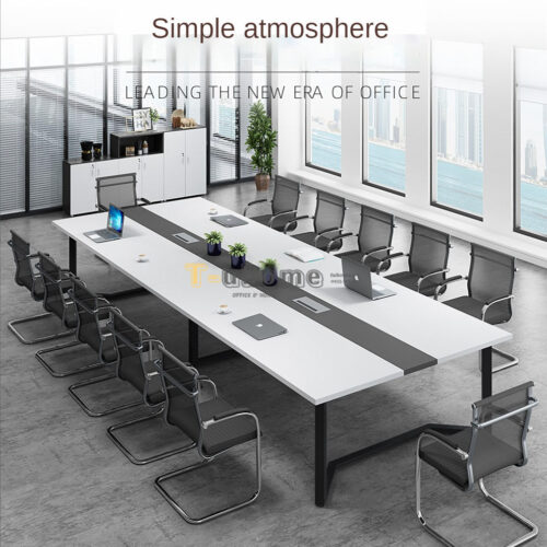 - Dải Trang Trí Xám Ghi Sáng Tạo: Chính giữa mặt bàn là một dải màu xám ghi chạy dọc theo chiều dài, tạo nên điểm nhấn thẩm mỹ độc đáo và phân chia không gian làm việc một cách khoa học cho những người tham gia.