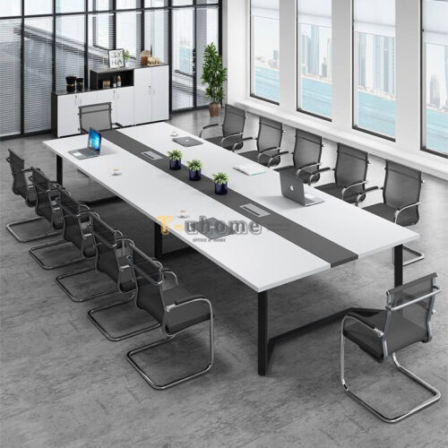 - Tông Trắng Chủ Đạo: Mặt bàn sử dụng gỗ công nghiệp phủ Melamine màu trắng tinh khôi, giúp không gian phòng họp trở nên sáng sủa, thông thoáng và mang hơi thở hiện đại.