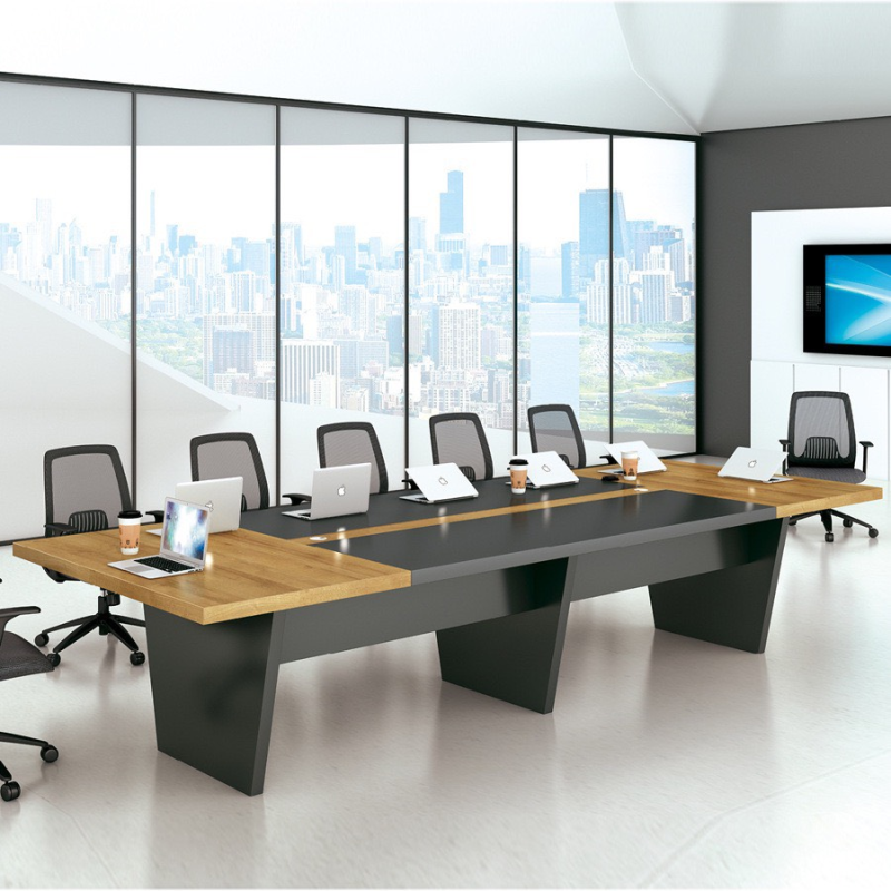 Bề mặt bàn được chia thành hai tông màu: phần gỗ công nghiệp sang trọng ở hai đầu và phần mặt đen ở trung tâm. Điều này không chỉ tạo điểm nhấn thẩm mỹ mà còn giúp bố trí laptop, tài liệu gọn gàng và dễ phân chia khu vực họp.