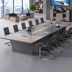 Phần mặt bàn trung tâm sử dụng màu đen nhám chống lóa, mang lại cảm giác tập trung và hiện đại. Hai bên cạnh là bề mặt gỗ công nghiệp màu sáng, giúp tổng thể hài hòa và tạo ánh nhìn ấm áp, cân bằng cho không gian phòng họp.