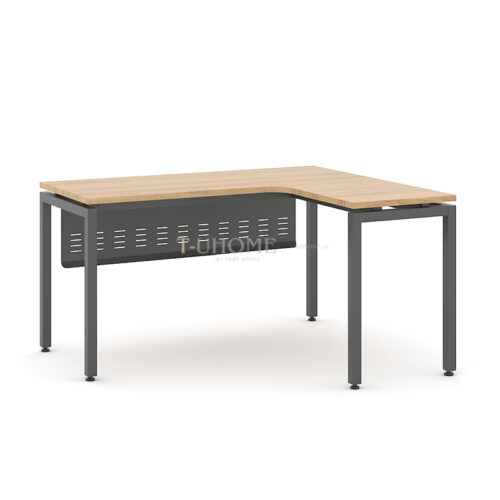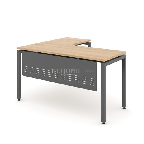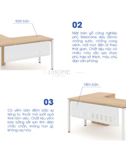 Mặt bàn được làm từ gỗ công nghiệp MDF phủ melamine có khả năng chống trầy – chống nước – dễ vệ sinh, giúp đảm bảo độ bền lâu dài. Màu gỗ sáng hiện đại tạo cảm giác thoải mái, giúp không gian làm việc thêm thoáng và chuyên nghiệp.