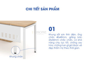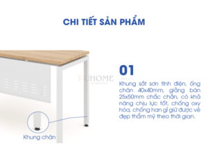 Khung chân bàn làm từ sắt hộp vuông sơn tĩnh điện màu trắng, có khả năng chống gỉ sét và chịu lực tốt. Kết cấu chân chắc chắn, đứng vững trên nhiều loại mặt sàn.