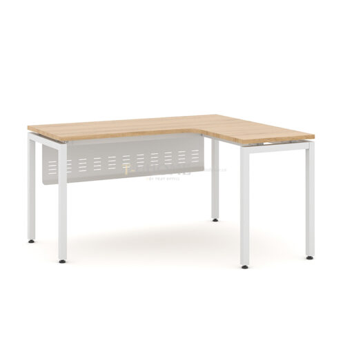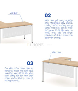 Mặt bàn được làm từ gỗ công nghiệp MDF phủ melamine có khả năng chống trầy – chống nước – dễ vệ sinh, giúp đảm bảo độ bền lâu dài. Màu gỗ sáng hiện đại tạo cảm giác thoải mái, giúp không gian làm việc thêm thoáng và chuyên nghiệp.