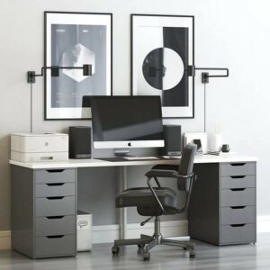 Bàn làm việc IKEA BLV-IKEA012 gây ấn tượng với thiết kế đối xứng hiện đại, mang đậm phong cách tối giản nhưng vẫn toát lên sự chuyên nghiệp và chắc chắn. Gam màu trắng tinh tế giúp không gian làm việc trở nên sáng sủa, gọn gàng và dễ dàng phối hợp với nhiều phong cách nội thất khác nhau.