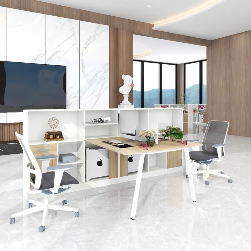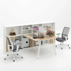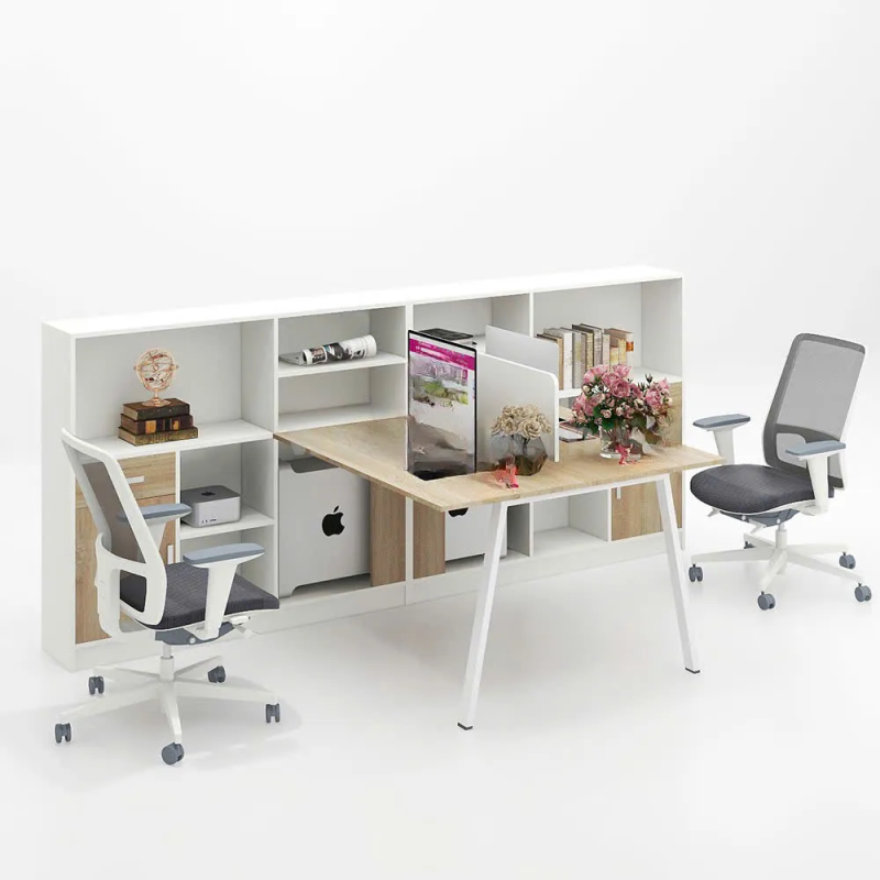 Cụm bàn CB2N-DE01 sở hữu thiết kế thông minh, kết hợp bàn làm việc cho hai người và một hệ thống tủ kệ lớn đặt ở phía sau (hoặc giữa). Mặt bàn làm việc được nâng đỡ bằng chân sắt hoặc chân gỗ mảnh, tạo không gian thông thoáng. Tủ kệ sau lưng đóng vai trò là vách ngăn nhẹ và khu vực lưu trữ chung, giúp phân định không gian mà không gây cảm giác bí bách.