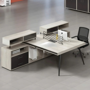Cụm bàn CB2N-DE03 sở hữu thiết kế 2 chỗ ngồi đối lưng (hai cặp đối lưng nhau), tạo thành một khối làm việc chung, tiết kiệm diện tích. Mỗi vị trí đều có mặt bàn rộng rãi để đảm bảo sự thoải mái. Phần trung tâm của cụm bàn là hệ thống kệ lưu trữ mở hoặc thấp, đóng vai trò là vách ngăn nhẹ, phân định không gian riêng tư cho từng người mà vẫn duy trì sự kết nối.