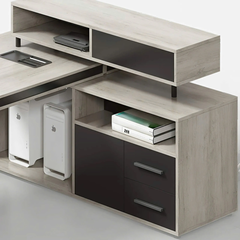 - Màu Trắng/Xám Nhạt: Màu trắng hoặc xám nhạt được sử dụng cho phần khung, chân bàn và các khối tủ nền, tăng tính hiện đại và làm sáng không gian chung.