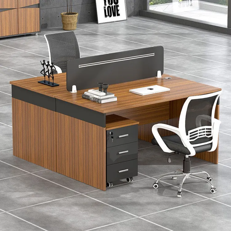 Cụm bàn CB2N-DE08 sở hữu thiết kế 2 chỗ ngồi đối diện (hoặc đối lưng), được nâng đỡ bằng chân hộp kín (chân gỗ công nghiệp) lớn màu đen/xám đậm. Thiết kế chân hộp không chỉ đảm bảo độ vững chắc tuyệt đối mà còn tăng tính thẩm mỹ mạnh mẽ, dứt khoát. Giữa hai vị trí làm việc có vách ngăn nỉ hoặc vách ngăn lửng màu xám, giúp phân chia không gian, giảm tiếng ồn và tăng sự tập trung cho mỗi nhân viên.