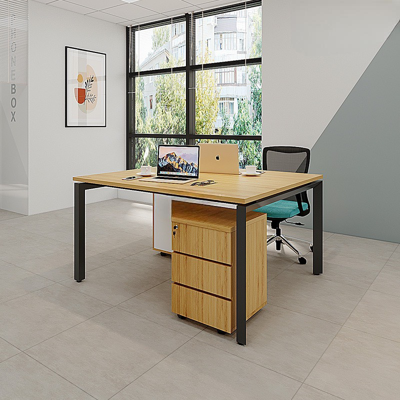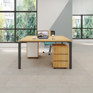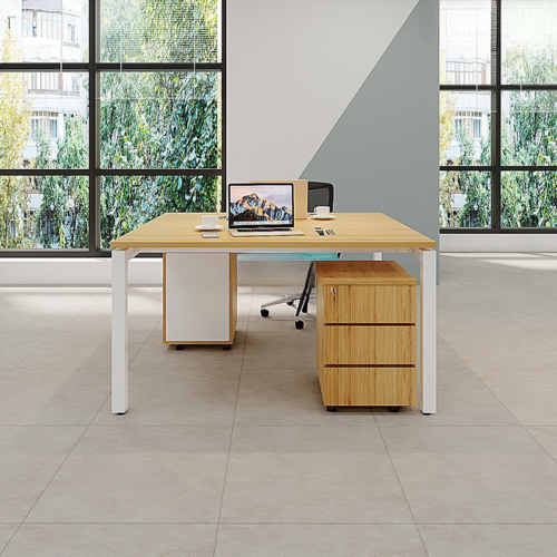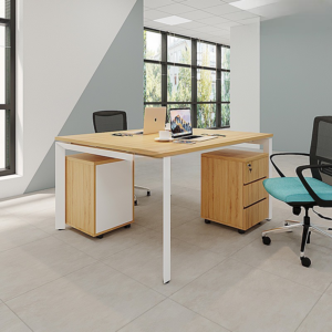 Cụm bàn CB2N-DE12 sở hữu thiết kế 2 chỗ ngồi hình chữ L đối xứng hoặc liền kề. Mỗi vị trí làm việc đều có mặt bàn chính rộng rãi và được kết nối với khối tủ kệ lớn, liền khối ở phía trước hoặc bên hông. Khối tủ này không chỉ cung cấp không gian làm việc thêm mà còn là điểm tựa vững chắc cho toàn bộ cụm bàn. Mặt bàn được nâng đỡ bằng chân kim loại mảnh ở phía ngoài, tạo cảm giác thanh thoát, hiện đại.