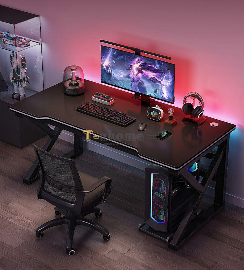 - Gầm Bàn Thông Thoáng: Thiết kế chân chữ X giúp không gian dưới gầm bàn trở nên cực kỳ rộng rãi. Người dùng có thể thoải mái đặt các thùng máy (case PC) kích cỡ lớn, hệ thống quản lý dây điện hoặc đơn giản là có không gian để chân thoải mái.