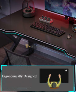 - Đường Vát Cong Tinh Tế: Mặt bàn được thiết kế với các đường cắt lượn (ergonomic cutout) ở vị trí ngồi của mỗi người. Thiết kế này giúp người dùng có thể tiến sát vào bàn hơn, tạo điểm tì tay thoải mái, từ đó giảm áp lực lên cổ tay và vai khi làm việc hoặc chơi game trong thời gian dài.