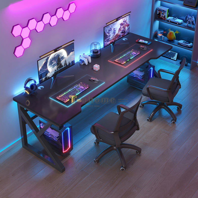 - Không Gian Trải Dài Liền Mạch: Mặt bàn là một tấm phẳng lớn màu đen mờ (matte black) sang trọng, mang lại diện tích sử dụng cực kỳ rộng rãi. Hai người có thể dễ dàng bố trí hệ thống màn hình đôi, bàn phím cơ, loa và các phụ kiện trang trí mà không lo thiếu chỗ.