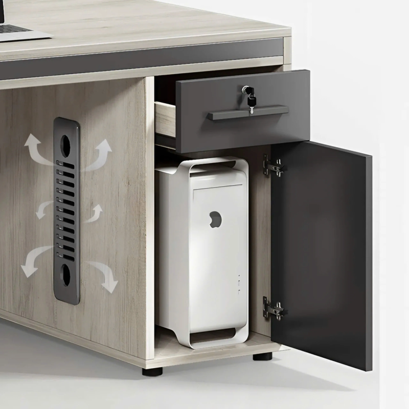 - Hộc Tủ Tích Hợp Lớn: Các hộc tủ lớn được tích hợp dưới mặt bàn, với ngăn kéo có khóa, đảm bảo lưu trữ hồ sơ, đồ dùng cá nhân một cách an toàn và kín đáo. Hộc tủ còn được thiết kế có lỗ thông gió (ventilation) để đặt CPU máy tính.