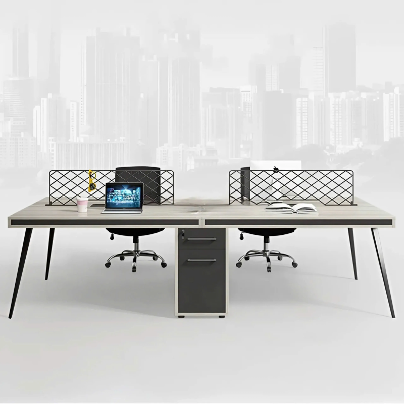Cụm bàn CB4N-CS07 sở hữu thiết kế 4 chỗ ngồi, sắp xếp đối lưng nhau, tạo thành một khối bàn chữ nhật dài. Mặt bàn rộng rãi được nâng đỡ bằng hệ thống chân sắt côn (chân hình tam giác ngược/chân thon) sơn tĩnh điện màu đen. Thiết kế chân côn không chỉ mang lại vẻ ngoài thanh lịch, độc đáo mà còn tối đa hóa không gian dưới gầm bàn, phù hợp với phong cách văn phòng hiện đại.