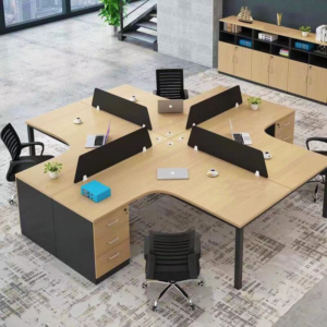 Cụm Bàn Làm Việc CB4N-EU03 là giải pháp nội thất module lý tưởng cho các nhóm 4 người, được thiết kế theo cấu hình chữ thập (quadrant/cross-shape). Điểm nổi bật là mặt bàn được thiết kế với góc cong (bo tròn), mang lại không gian làm việc rộng rãi, thoải mái cho người dùng và tạo ra sự năng động, trẻ trung cho văn phòng với các chi tiết màu cam nổi bật.