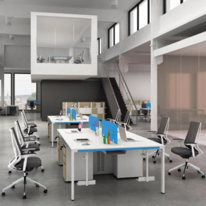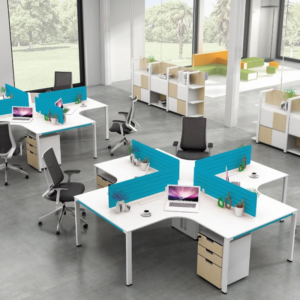 - Vách Ngăn Mica Xanh: Vách ngăn mica màu xanh dương phân tách rõ ràng 4 khu vực làm việc, cung cấp sự riêng tư cần thiết, đồng thời là chi tiết thẩm mỹ quan trọng của cụm bàn.