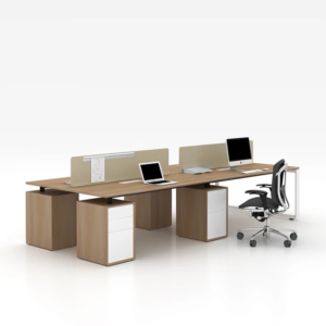 CB4N-EU09 sở hữu thiết kế 4 chỗ ngồi, sắp xếp đối lưng nhau, thường được bố trí thành hai module bàn đôi đối diện, được phân tách bởi khối tủ kệ lớn: