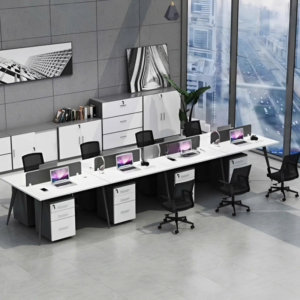 - Hộc Tủ Di Động Cá Nhân: Bàn đi kèm với các hộc tủ di động (hộc tủ bánh xe) 3 ngăn kéo có khóa với thân trắng và mặt ngăn kéo xám đậm, cung cấp không gian lưu trữ an toàn và linh hoạt cho mỗi nhân viên.