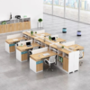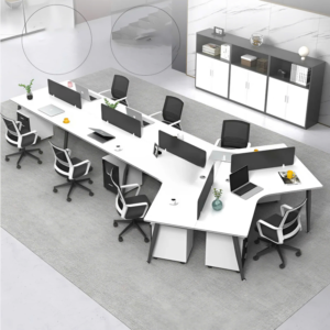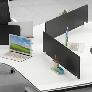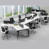 Nhìn tổng thể, cụm bàn nổi bật với bố cục dạng zigzag độc đáo, tạo khoảng cách hợp lý giữa từng vị trí làm việc. Kiểu dáng này không chỉ tăng sự riêng tư mà còn mở rộng không gian để người dùng đặt laptop, tài liệu, máy tính để bàn hay các phụ kiện cần thiết. Các vách ngăn màu đen mang lại sự nhã nhặn và hiện đại, đồng thời hỗ trợ hạn chế xao nhãng hiệu quả.
