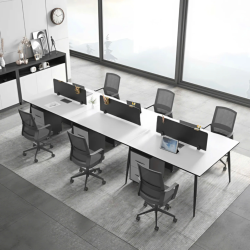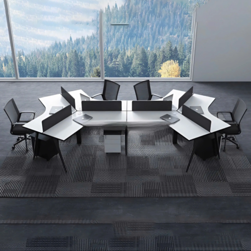 Nhìn tổng thể, cụm bàn nổi bật với bố cục dạng zigzag độc đáo, tạo khoảng cách hợp lý giữa từng vị trí làm việc. Kiểu dáng này không chỉ tăng sự riêng tư mà còn mở rộng không gian để người dùng đặt laptop, tài liệu, máy tính để bàn hay các phụ kiện cần thiết. Các vách ngăn màu đen mang lại sự nhã nhặn và hiện đại, đồng thời hỗ trợ hạn chế xao nhãng hiệu quả.