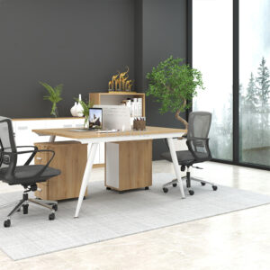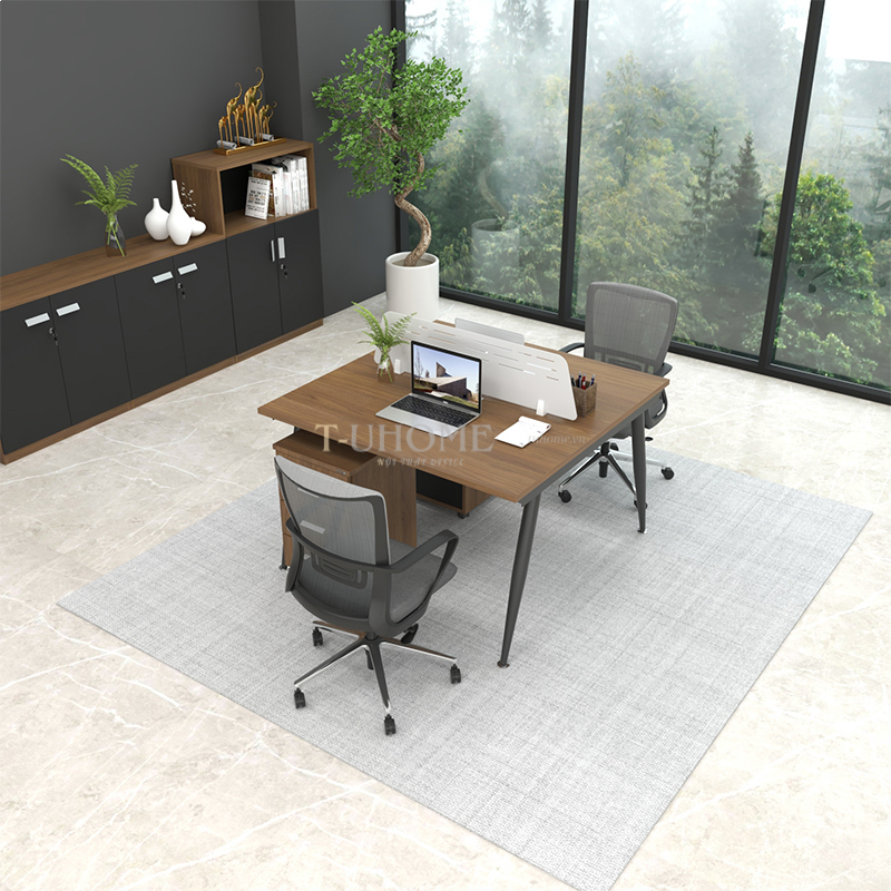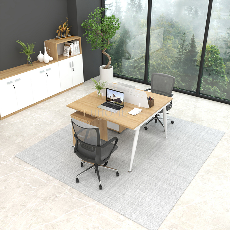 VE12-01 sở hữu mặt bàn gỗ công nghiệp MDF phủ Melamine màu vân gỗ sáng tự nhiên, mang lại cảm giác ấm cúng nhưng không kém phần sang trọng. Bề mặt chống trầy xước, chống ẩm nhẹ và dễ vệ sinh, phù hợp sử dụng lâu dài trong môi trường văn phòng.