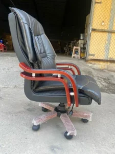 - Lưng Ghế Cao Bọc Da: Ghế được thiết kế lưng cao, hỗ trợ toàn bộ phần lưng và đầu. Chất liệu bọc là da hoặc simili cao cấp (thường là màu đen hoặc nâu đậm), với các đường may và múi da tạo sự êm ái, bồng bềnh và sang trọng.