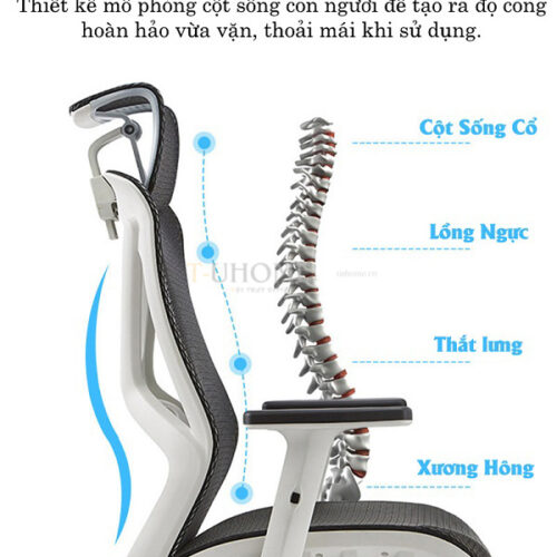 Ghế được trang bị tựa đầu điều chỉnh linh hoạt, giúp nâng đỡ tối ưu cho vùng cổ và vai. Tính năng này đặc biệt quan trọng đối với người làm việc văn phòng, thường xuyên ngồi lâu và dễ bị mỏi vai gáy.