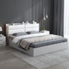 - Đầu Giường Bọc Đệm: Phần đầu giường được thiết kế bo cong mềm mại và bọc đệm da/nỉ màu trắng, mang lại sự êm ái khi người dùng tựa lưng, tạo điểm nhấn sang trọng và thoải mái.