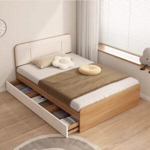 - Ngăn Kéo Dưới Gầm Lớn: Giường được trang bị ngăn kéo lớn nằm dọc theo thân giường, với mặt ngăn kéo màu trắng tạo sự tương phản. Những ngăn kéo này cung cấp không gian lý tưởng để cất giữ quần áo, chăn màn dự phòng, hoặc các vật dụng theo mùa, giúp giải phóng không gian tủ trong phòng.