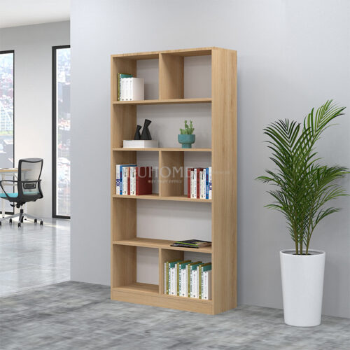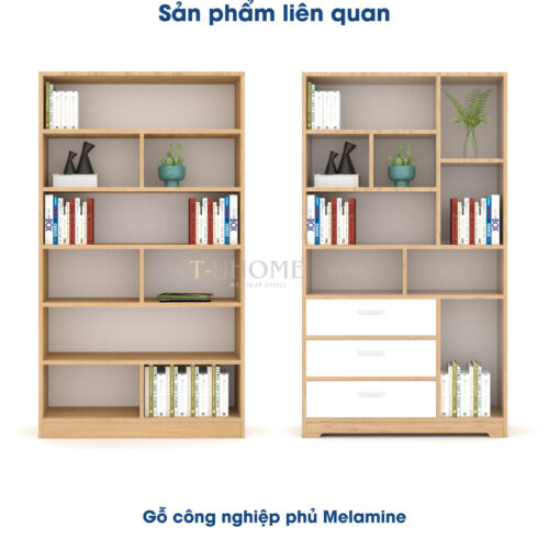 Phần dưới của kệ gồm các ô rộng và sâu, mang đến không gian lưu trữ thoải mái cho số lượng lớn sách vở, hồ sơ hoặc các vật dụng ít dùng. Bố cục so le giữa các ô tạo sự cân bằng cho tổng thể thiết kế, giúp sản phẩm trông hiện đại và bắt mắt hơn nhưng vẫn đảm bảo tính ứng dụng cao.