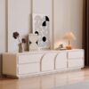 - Nét Hình Học Độc Đáo: Đường nét bo tròn và viền lõm trên cánh tủ là điểm nhấn nghệ thuật, khiến chiếc kệ trở nên độc đáo và sang trọng hơn.
