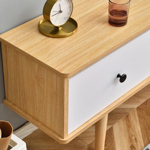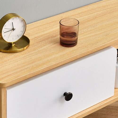 - Chất Liệu và Màu Sắc: Kệ được làm từ gỗ công nghiệp với bề mặt phủ Melamine hoặc Laminate. Mặt kệ và khung sử dụng vân gỗ sáng màu tự nhiên, trong khi ngăn kéo là màu trắng.