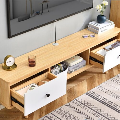 - Bề Mặt Rộng: Mặt trên kệ vân gỗ sáng là không gian lý tưởng để đặt tivi, loa, đèn bàn và các vật phẩm trang trí khác.