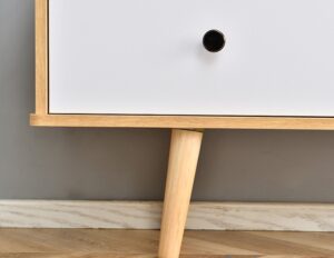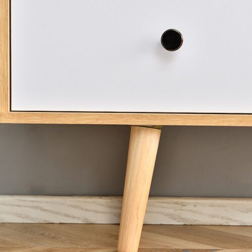 - Chân Gỗ Nghiêng: Kệ được đặt trên chân gỗ cao, thiết kế nghiêng chéo, một đặc điểm nổi bật của nội thất Scandinavian. Chi tiết này không chỉ tăng tính thẩm mỹ thanh thoát mà còn giúp dễ dàng vệ sinh sàn nhà.