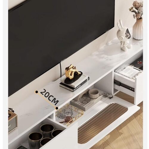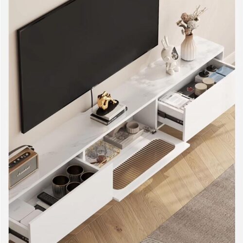 - Khối Hộp Phẳng Tuyệt Đối: Kệ có dạng khối hộp chữ nhật dài, thấp, màu trắng, mang lại vẻ ngoài sạch sẽ và liền mạch. Các khối tủ hai bên thường là cánh tủ kín (có thể là ngăn kéo hoặc cánh mở) để cất giấu các thiết bị điện tử, dây cáp và phụ kiện.