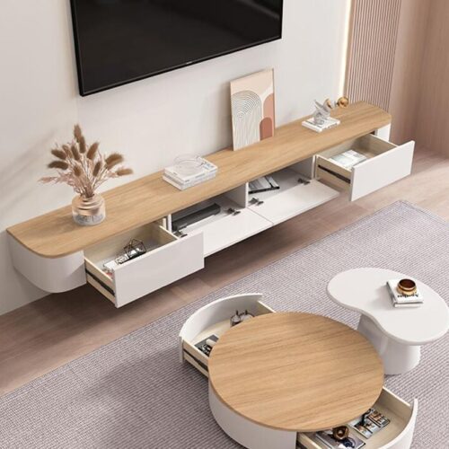 - Lưu Trữ Kết Hợp: Cung cấp không gian trưng bày rộng rãi trên mặt kệ vân gỗ và không gian kín đáo để quản lý dây cáp và thiết bị bên trong khối tủ trắng.