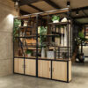 Các hộc gỗ được sản xuất từ gỗ MDF phủ Melamine, có khả năng chống ẩm, chống trầy, màu sắc đẹp và dễ lau chùi. Những khoang gỗ màu sáng xen kẽ khung thép đen tạo ra sự tương phản tinh tế, giúp không gian trông sang trọng và nổi bật hơn