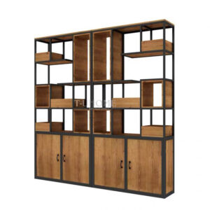 Các hộc gỗ được sản xuất từ gỗ MDF phủ Melamine, có khả năng chống ẩm, chống trầy, màu sắc đẹp và dễ lau chùi. Những khoang gỗ màu sáng xen kẽ khung thép đen tạo ra sự tương phản tinh tế, giúp không gian trông sang trọng và nổi bật hơn