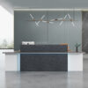 Mặt trước của quầy nổi bật với tấm ốp hình lục giác cách điệu màu xám đậm, tạo điểm nhấn trung tâm giúp tổng thể trở nên sang trọng và khác biệt so với các mẫu quầy thông thường. Sự hòa quyện giữa vân gỗ tự nhiên và gam màu xám mạnh mẽ mang lại cảm giác hài hòa, hiện đại, dễ dàng hòa nhập với đa dạng phong cách nội thất, từ tối giản đến cao cấp.