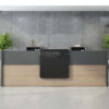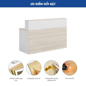 Thiết kế quầy gồm hai phần chính: phần mặt trước lớn và phần hộc nâng phía trên giúp tạo điểm nhấn thị giác đồng thời mang lại sự riêng tư cho nhân viên lễ tân trong quá trình làm việc. Kiểu dáng vuông vắn, gọn gàng, các đường nét được xử lý mượt mà, tạo nên vẻ ngoài tinh tươm và hiện đại, phù hợp cho văn phòng công ty, spa, showroom, cửa hàng hoặc khu vực sảnh của các doanh nghiệp dịch vụ.