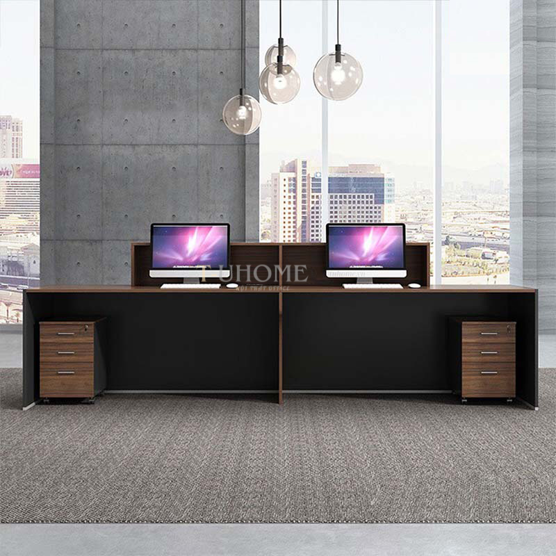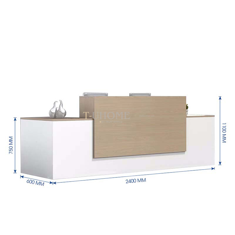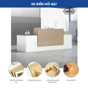 Phần khung quầy màu trắng được thiết kế vuông vắn, sạch sẽ và tinh gọn, mang đến sự hiện đại và dễ dàng phối hợp với nhiều kiểu trang trí văn phòng. Mặt bàn làm việc bên trong rộng rãi, được bố trí khoa học để nhân viên lễ tân có thể thao tác nhanh chóng, sắp xếp hồ sơ, máy tính và vật dụng một cách ngăn nắp. Thiết kế chiều cao tiêu chuẩn giúp đảm bảo dáng ngồi đúng chuẩn, hỗ trợ làm việc lâu dài mà không gây mệt mỏi.