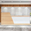Mặt trước của quầy được thiết kế với các đường nét thẳng gọn gàng, tạo cảm giác hiện đại và thanh lịch. Phần panel gỗ nổi bật ở trung tâm không chỉ tăng điểm nhấn về thị giác mà còn giúp khu vực lễ tân trở nên chuyên nghiệp hơn khi giao tiếp với khách. Thiết kế tối ưu chiều cao, giúp nhân viên lễ tân vừa đảm bảo sự riêng tư trong thao tác vừa thể hiện sự thân thiện và dễ kết nối.