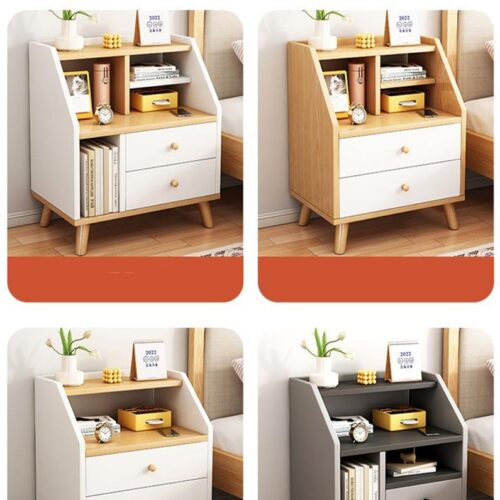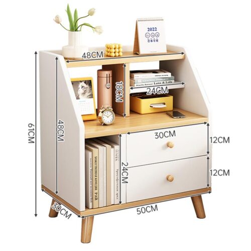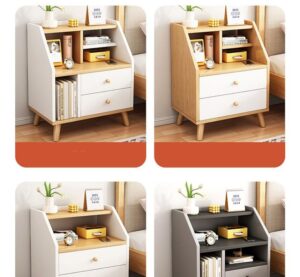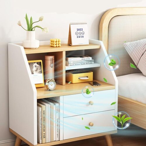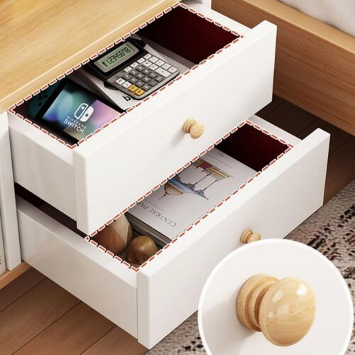 - Ngăn Lưu Trữ Kết Hợp: Tủ bao gồm phần kệ mở phía trên (thường có một hoặc hai ngăn) để đặt đèn ngủ, đồng hồ báo thức, sách đang đọc hoặc các vật dụng trang trí. Phía dưới là hai ngăn kéo kín với mặt trước màu trắng, phù hợp để cất giữ vật dụng cá nhân, thuốc men hoặc vật dụng khác cần sự riêng tư.