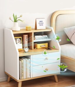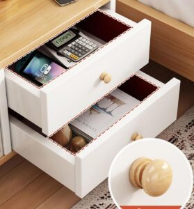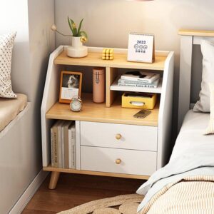- Ngăn Lưu Trữ Kết Hợp: Tủ bao gồm phần kệ mở phía trên (thường có một hoặc hai ngăn) để đặt đèn ngủ, đồng hồ báo thức, sách đang đọc hoặc các vật dụng trang trí. Phía dưới là hai ngăn kéo kín với mặt trước màu trắng, phù hợp để cất giữ vật dụng cá nhân, thuốc men hoặc vật dụng khác cần sự riêng tư.